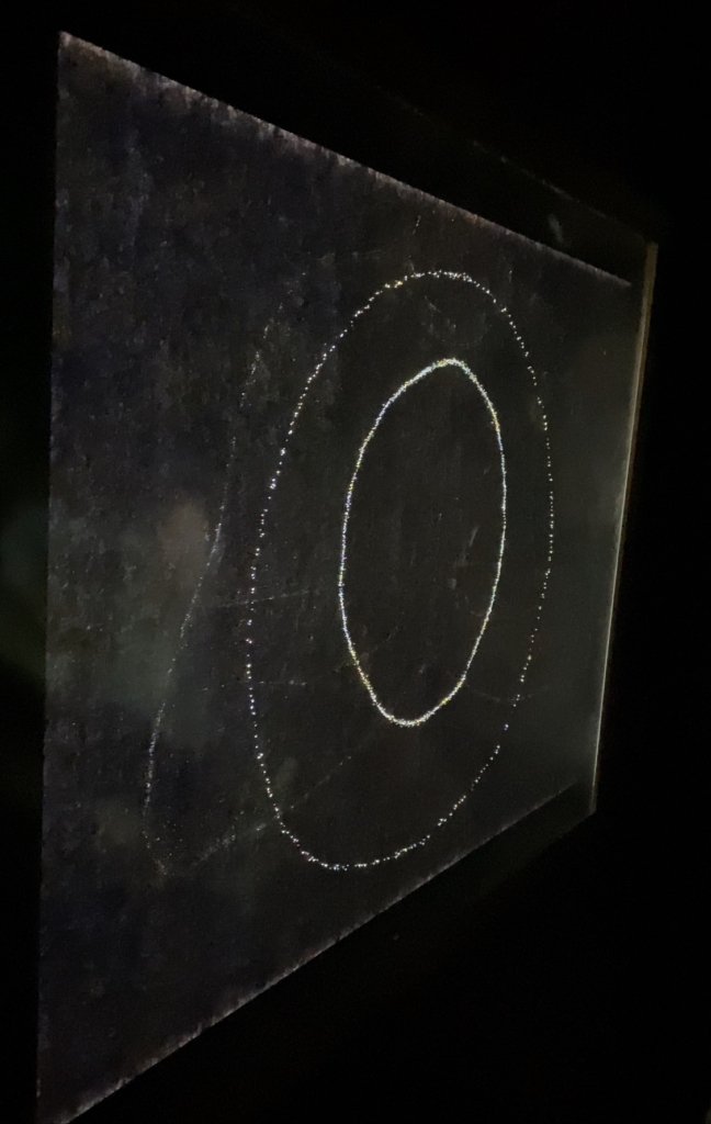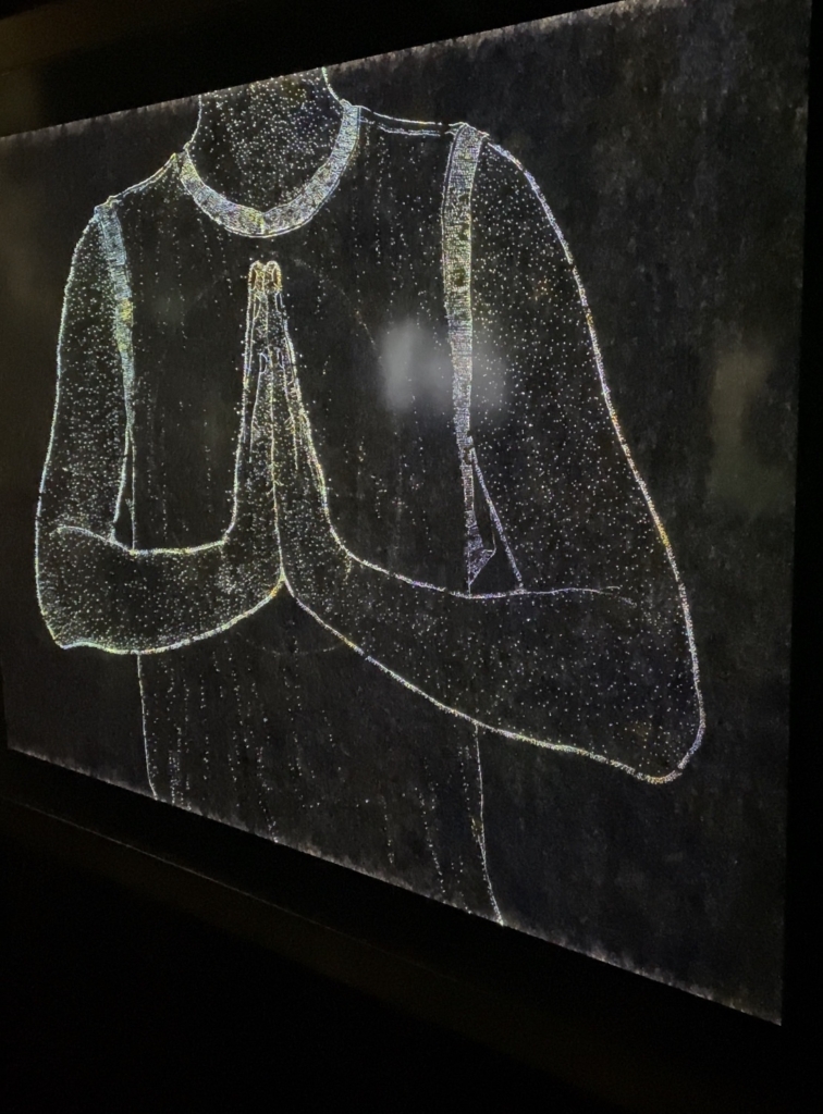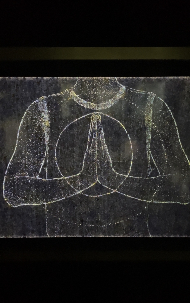 3階は一変し暗闇の空間が広がります。「KONNMASA」さんの「光の作品」がヒーリングの音楽と共に展示され「癒し」の感覚に包まれます。独特な作品は、和紙に無数の穴を開けそこからじんわり溢れる光が奏でる幻想の世界、瞑想部屋 作品の全て角度によって模様や画が変化する!気がついた時は感動すら感じ心奪われる空間だった。